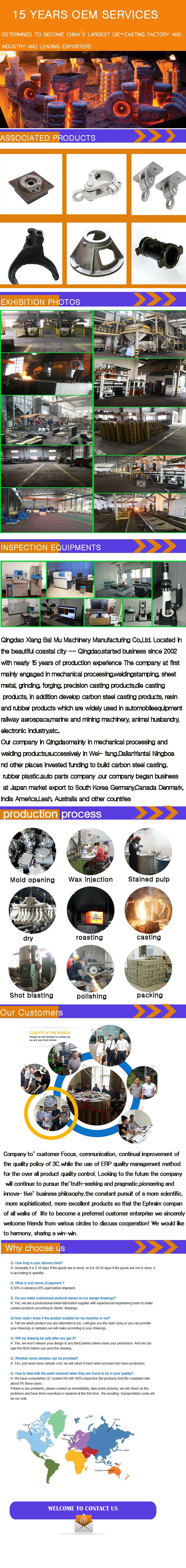 | Production facility | 1.Casting facility: Furan resin sand molding line,Medium frequency induction furnace, Shot blasting machine 2.Machining facility: CNC, NC lathe,vertical lathe, boring machine, milling machine, other ordinary machine tools, linear cutting machine |